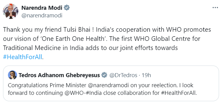 Prime Minister Narendra Modi recently took to Twitter to announce India’s collaboration with the World Health Organization (WHO). The tweet read, “Thank you my friend Tulsi Bhai. India’s cooperation with WHO promotes our vision of ‘One Earth One Health’. The first WHO Global Centre for Traditional Medicine in India adds to our joint efforts towards Health For All.”